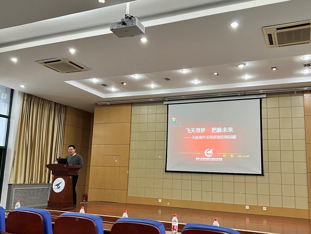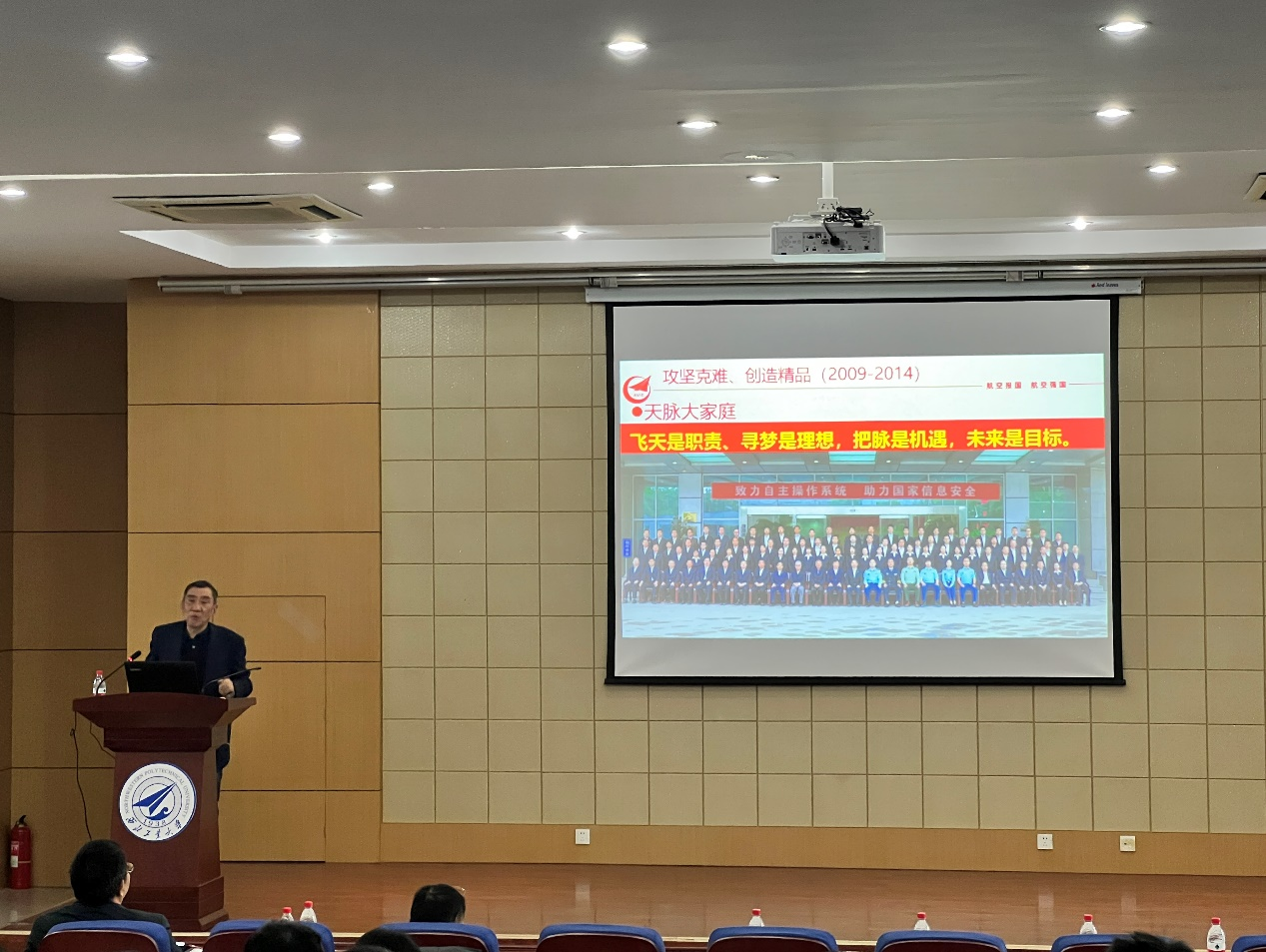 叶宏以天脉操作系统研制历程回顾为主线,按照“机遇、挑战和决策”“困境中寻梦历程”“攻坚克难、创造精品”“路漫漫其修远兮”等四个部分给师生们分享了天脉操作系统研制的时代背景、面对的挑战、方案论证、技术攻关、对比论证、选型装机以及国产机载操作系统全面转机等奋斗历程,创造了国产机载操作系统的辉煌。