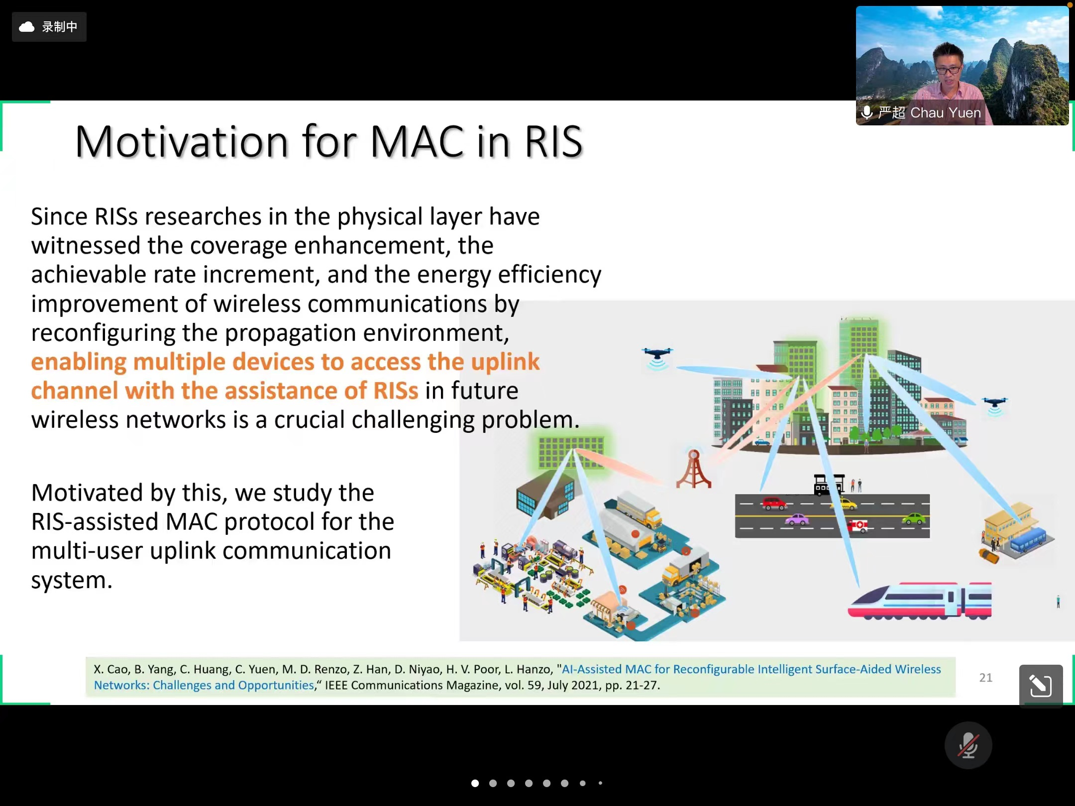 杨博老师在开场时首先为同学们介绍了主讲人的个人经历和学术背景。Chau Yuen教授是IEEE Fellow、IEEE VTS杰出讲师。分别于2000年和2004年在新加坡南洋理工大学获得工学学士和博士学位。获得过李光耀金奖、电气工程师学会图书奖、新加坡工程学会金奖、默克夏普和多姆金奖,两次获得惠普奖,曾于2012年获得IEEE亚太杰出青年研究员奖。研究领域为智能可重构表面、无线通信网络、边缘计算、物联网/智能电网等。接着活动进入正题,Chau Yuen教授为同学们介绍了基于AI的RIS无线网络的一些最新结果,特别是基于深度学习的RIS波束成形、AI辅助的RIS MAC协议以及基于智能频谱学习的RIS设计。各种先进技术和前沿知识令同学们打开了视野,感受到了浓厚的学术氛围。之后的提问环节,Chau Yuen教授针对同学们提出的专业相关的疑问以及留学的相关问题都做了详细解答,介绍了不同阶段需要的知识和技术,为今后同学们的学习拓宽了思路,并提高了未来研究方向的多样选择。
