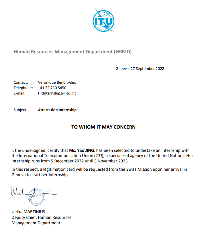 博士生景瑶同学脱颖而出,成功斩获国际电信联盟(联合国机构)实习offer,并将于2022年12月5日启程,赴瑞士日内瓦国际电信联盟电信标准化司进行为期近1年的实习,主要负责智能交通系统和道路安全人工智能方面的工作。这是我校首次有同学获国家留学基金委资助赴该联合国机构实习,其它入选的同学均来自UCLA、清华等全球著名学府。
