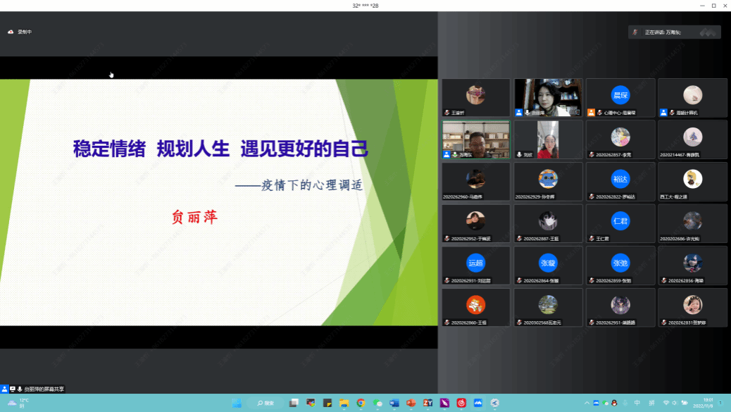 万海东在主持时表示,肆虐全球近三年的新冠肺炎疫情依旧严峻,但全校师生在学校党委的领导下积极配合并落实各项防疫政策,充分发扬艰苦奋斗精神,彰显了西工大学子的青春担当,为平安校园建设做出了贡献。同时日趋严峻的就业形势以及逐渐逼近的毕业压力都或多或少给师生的心理影响,甚至部分同学心理出现不适症状。为此,学院特邀请贠老师给大家带来心理健康专题报告,希望以此为契机,帮助大家提升调适心理状态的能力,遇见更好自己。
