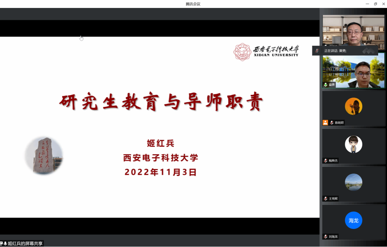 召开了“2022年度第二场研究生导师培训会”,主题为“研究生教育与导师职责”。由于疫情防控的需要,本次培训会采用线上形式召开,邀请了西安电子科技大学原研究生院常务副院长、发展规划处处长兼211工程办公室主任姬红兵教授担任主讲,直播大秀