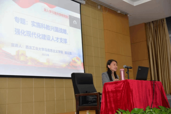 百年大计,教育为本。党的二十大报告强调,要坚持教育优先发展、科技自立自强、人才引领驱动,加快建设教育强国、科技强国、人才强国。杨云霞以《实施科教兴国战略,强化建设现代化建设人才支撑》为题,从党的二十大报告中的相关内容、新时代十年科技领域的伟大变革、教育科技人才领域的目标任务、我国科技自立自强、高校科技创新的责任五个方面进行了内容翔实、逻辑严密、讲授生动的精彩宣讲,让与会人员进一步明确了新时代教育工作和科技创新工作的前进方向,深刻认识到应该肩负的责任,坚定了为加快建设教育强国、科技强国、人才强国做贡献的信念,激发了广大师生学习贯彻二十大精神,建设双一流、奋进新征程,建设社会主义现代化国家的斗志和热情。