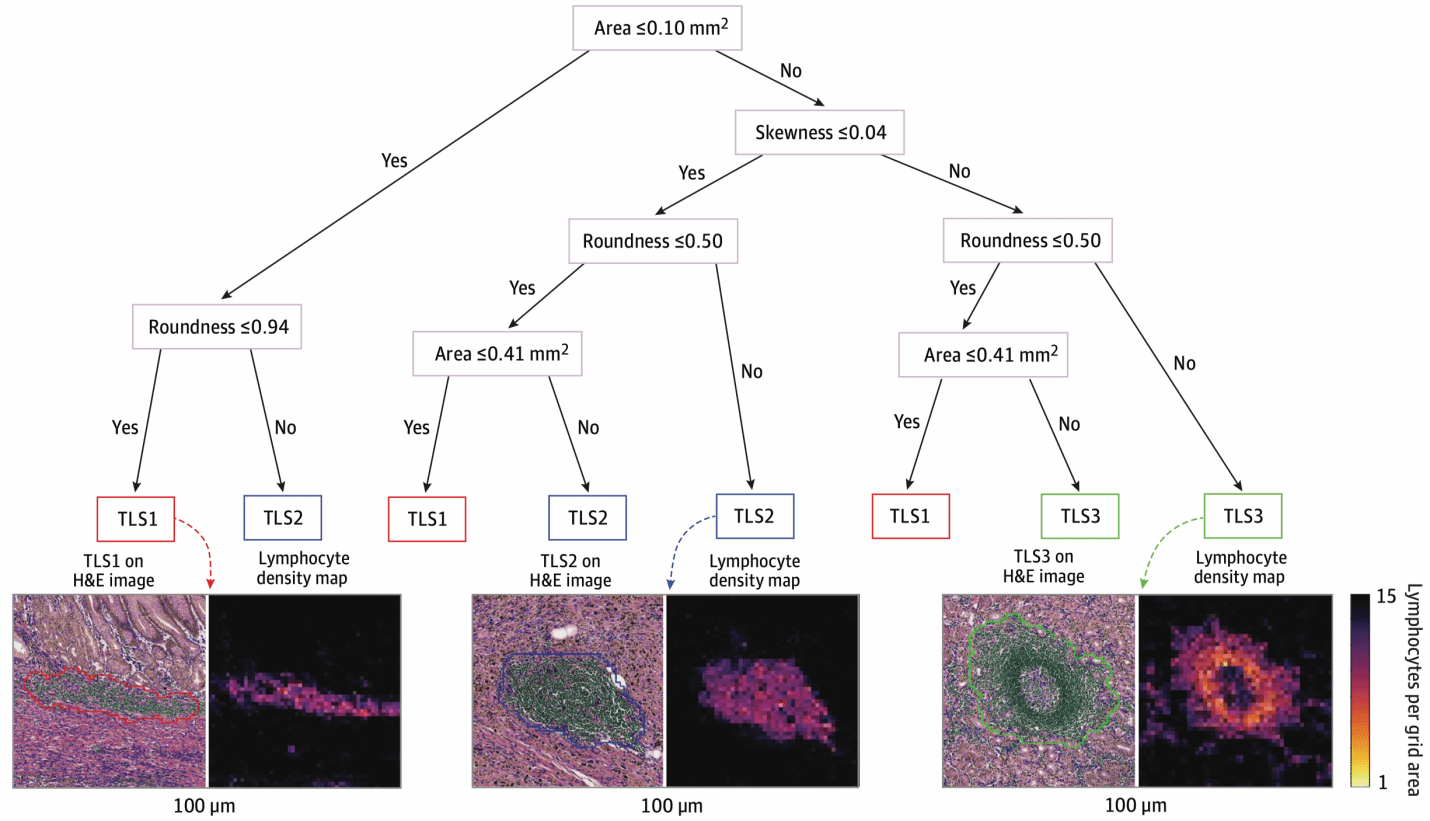 基于此,西北工业大学夏勇教授课题组和斯坦福医学院Ruijiang Li副教授课题组合作开发并验证了一种临床可解释的机器学习模型,用于从H&E染色的组织病理学图像中自动检测、计数和分类三级淋巴结构。该模型首先利用深度学习对H&E染色切片进行单细胞分析从而得到淋巴细胞密度图,再训练一个可解释的决策树以获得三级淋巴结构的分割分类结果。同时,还设计了一种三级淋巴结构定量评分系统,并在1924名胃肠道癌症患者中研究了这种评分系统与患者生存之间的关系。实验结果显示,我们提出的三级淋巴结构评分是一个与生存率相关的独立预后因素。本研究为自动化检测和评估三级淋巴结构提供了新的技术手段。