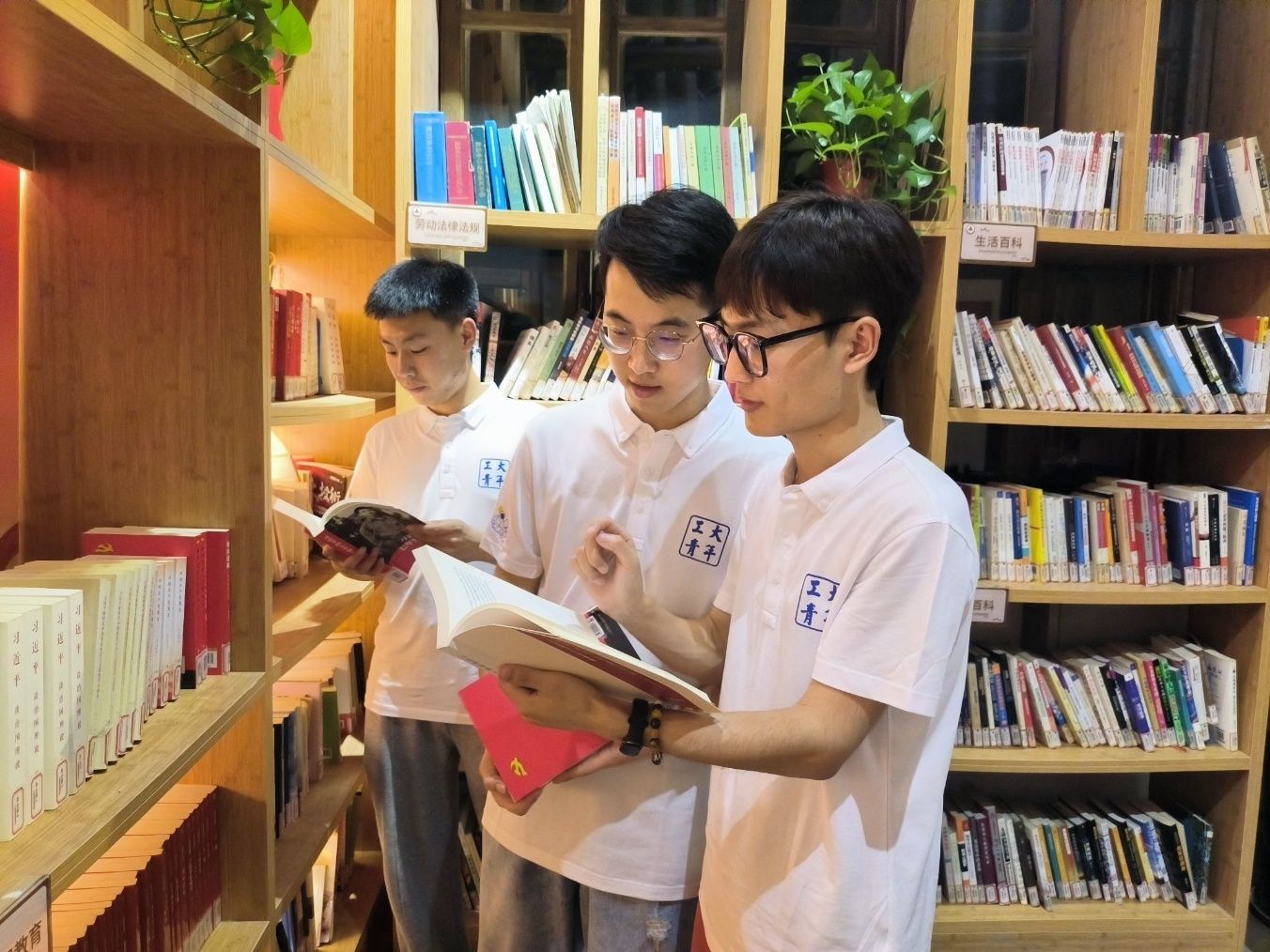 梁溪红潮涌,党建新作为。实践队来到了运河之畔、南长街内的“古韵南禅·红色驿站”基层党建指导站。穿过长长的夹弄,独具运河特色的红色文化墙映入实践队员眼前。中国共产党的发展历史、无锡地区的党史资料、新中国成立以来的辉煌成就,次第浮现,让实践队员们在捕捉历史变迁的浮光掠影中完成红色文化的“充电蓄能”。随后,实践队一行来到“古韵南禅·红色驿站”的“南书房”主题活动区,翻阅红色书籍,聆听伟人教诲。在书中,实践队员们感受着文字穿越时空的精神伟力,聆听着百年奋斗的雄壮号角,领悟着“对祖国血浓于水、与人民同呼吸共命运的情感贯穿学业全过程、融汇在事业追求中”的谆谆教诲。