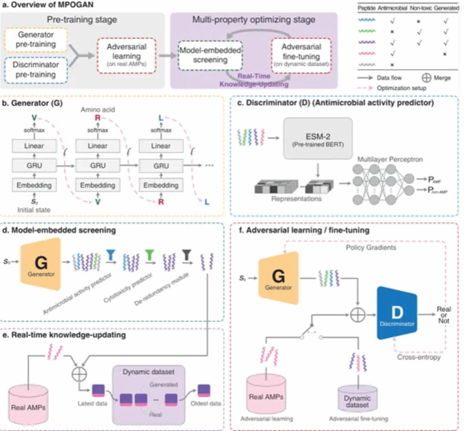 抗菌肽(AMP)是一类具有抗菌活性的小分子多肽药物,由于其广谱抗菌特性且不易诱导细菌产生耐药性,AMP成为应对全球细菌耐药性问题的重要研究方向。然而,AMP从头设计领域目前仍面临诸多挑战。实验室合成AMP的过程耗时且成本高昂;且抗菌肽不同属性之间可能存在冲突,使得现有计算方法难以同时优化多种目标特性(如抗菌活性、低毒性和序列多样性等)。为了解决这些挑战,该论文提出了面向抗菌肽多属性同步优化的生成对抗网络(MPOGAN)。通过设计嵌入式和串联式的属性评估器,筛选生成模型生成的高质量肽序列,并提出实时知识更新(RTKU)策略,动态更新训练数据集,从而迭代学习肽序列与多种治疗属性之间的关系,使生成模型逐渐具备生成具有多种优良属抗菌肽的能力。实验结果表明,MPOGAN在生成满足多种目标属性(高抗菌活性、低毒性和序列多样性)的抗菌肽方面优于现有方法。通过与西北工业大学生命学院合作,研究团队合成了10条候选抗菌肽,并进行了体外测试,结果显示其中9条AMP表现出较高的抗菌活性和低细胞毒性,其中2条肽展现出强效、广谱抗菌活性和更低的细胞毒性。进一步的抗耐药菌实验、膜破裂电镜实验和分子动力学模拟结果表明,最具潜力的1条肽(MPOP-03)具有良好的安全性和选择性,并对多种耐药菌株表现出显著的抗菌活性。上述实验结果表明,MPOGAN为多属性优良抗菌肽的从头设计提供了一种高效的人工智能工具,大幅提升了生物实验验证成功率。