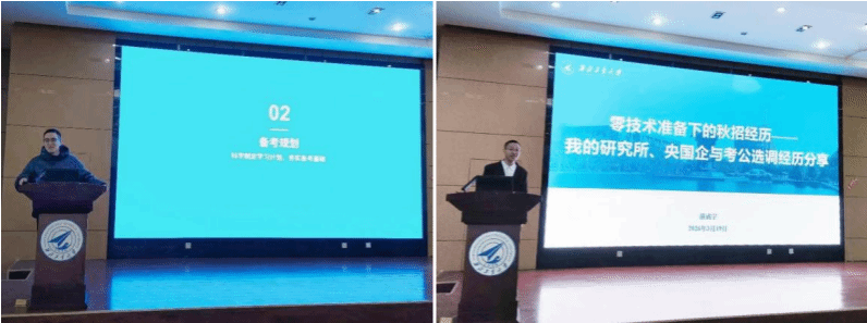 分享会上,五位同学立足不同赛道,分享了各自在求职路上的宝贵经验,生动展现了新时代青年将个人理想融入国家发展的奋斗姿态。魏佳何结合自身在研究所的求职实践,系统梳理了科研岗位从简历投递到面试考核的全过程。她提到,在求职中要将科研成果与岗位需求精准对接,突出专业能力与实践经验的契合度,以实际行动践行科技报国的初心。杨裕平围绕定向选调展开讲解,阐释了选调生的定义与政策优势,汇总了各省报考条件与考试要点,剖析了笔面试的备考策略与技巧,鼓励同学们扎根基层、服务人民,在祖国最需要的地方挥洒青春。