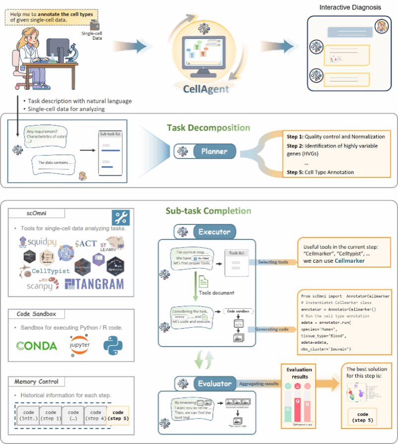 为解决这些难题,研究团队提出了一种基于大语言模型(LLM)驱动的自治多智能体框架CellAgent,用于通过自然语言交互执行端到端的单细胞和空间转录组数据分析。CellAgent采用分层决策框架,包含规划器(Planner)、执行器(Executor)和评估器(Evaluator)三个专门的智能体,模拟“深度思考”工作流,以确保分析步骤逻辑连贯并符合研究目标。为增强系统能力,团队还开发了scOmni,一个高性能且融合专家知识的分析工具。此外,框架引入了自反思优化机制,通过专业的自动化评估方法迭代完善结果,有效取代了传统的人工评估。实验结果表明,CellAgent在超过60个数据集上的平均执行成功率达到96%以上,在效率上显著超越人类专家,并在细胞类型注释、批次效应校正、轨迹推断和空间转录组插补等多个下游任务中,取得了与当前各类专用SOTA方法相当甚至更优的表现,通过对话方式将复杂科学问题转化为数据分析工作流,极大降低了技术门槛,推动了单细胞组学的科学发现。